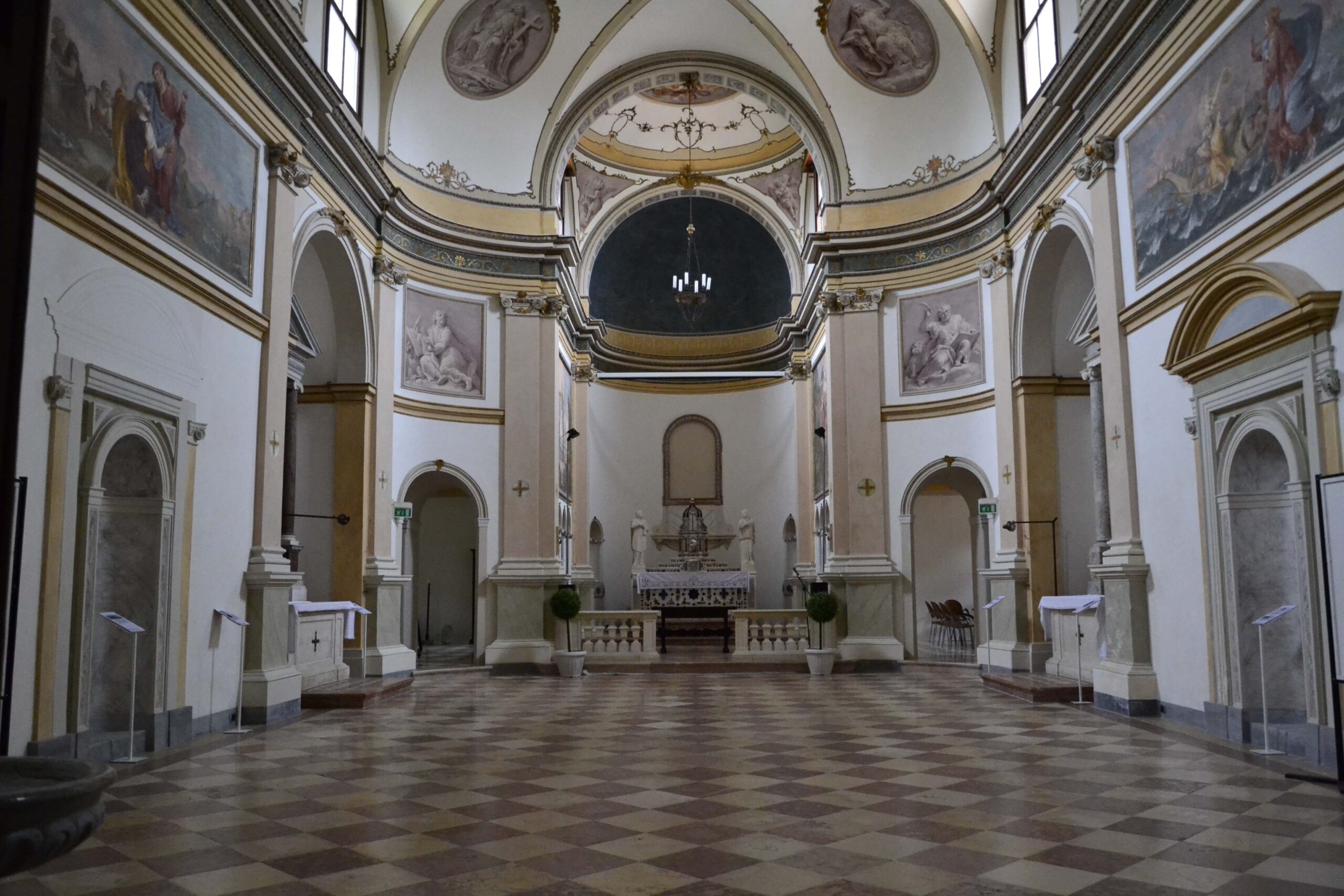 All’interno della chiesa, molto elegante, da segnalare il pregevole ciclo di affreschi con storie dell’Antico e del Nuovo Testamento di Giambattista Canal (1817) e due pale d’altare molto interessanti.
